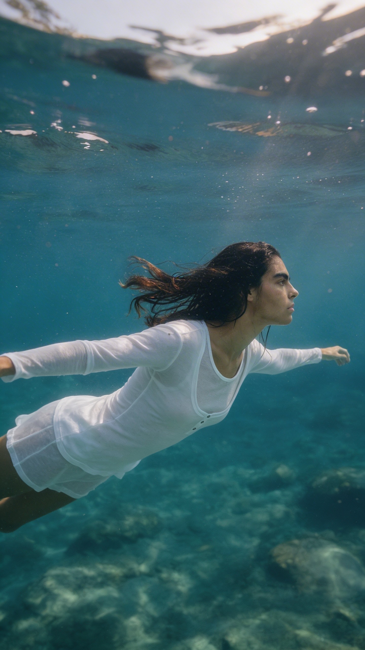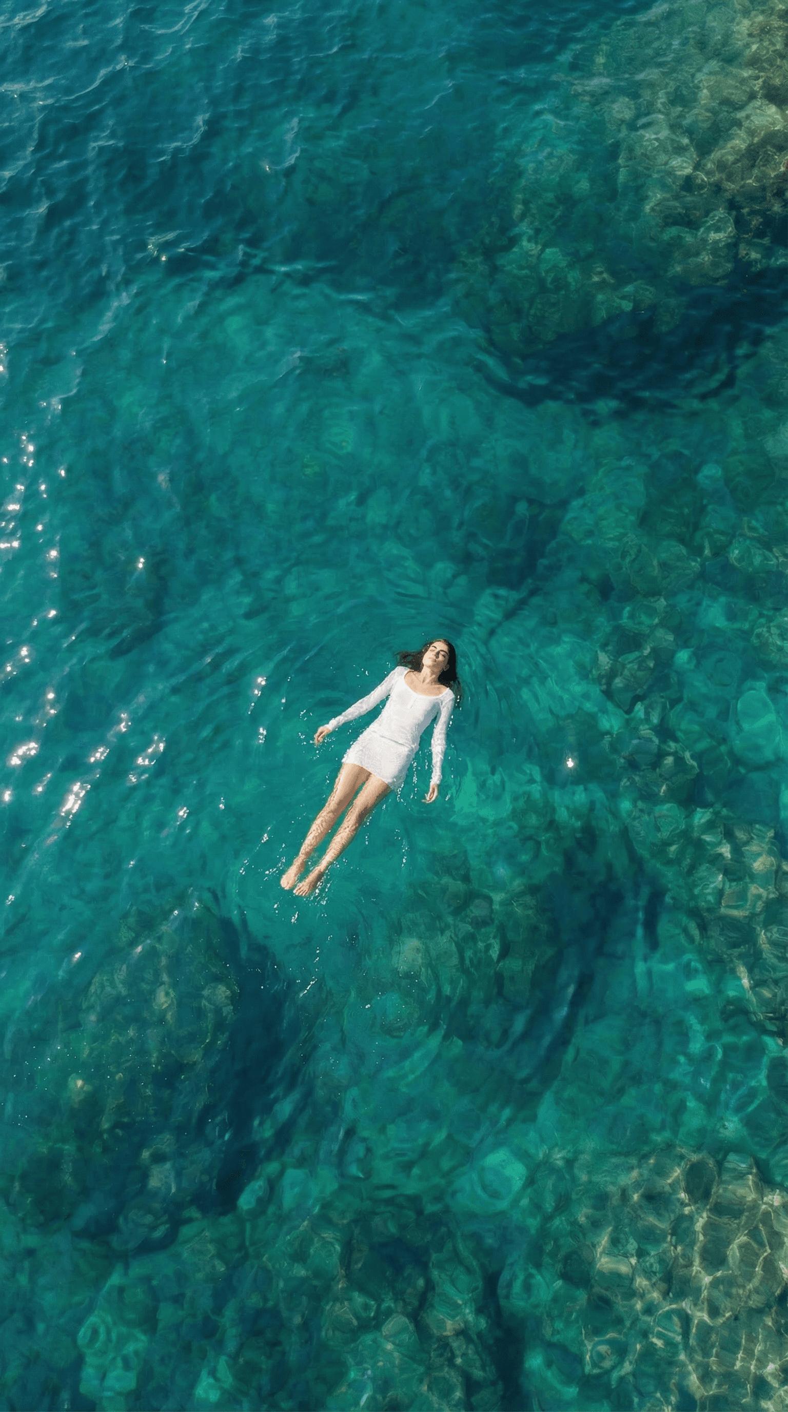 Set within the Mediterranean, the concept follows a solitary figure suspended between water and air. Fabrics drift, float, and respond to the natural environment, emphasizing material presence and quiet strength.