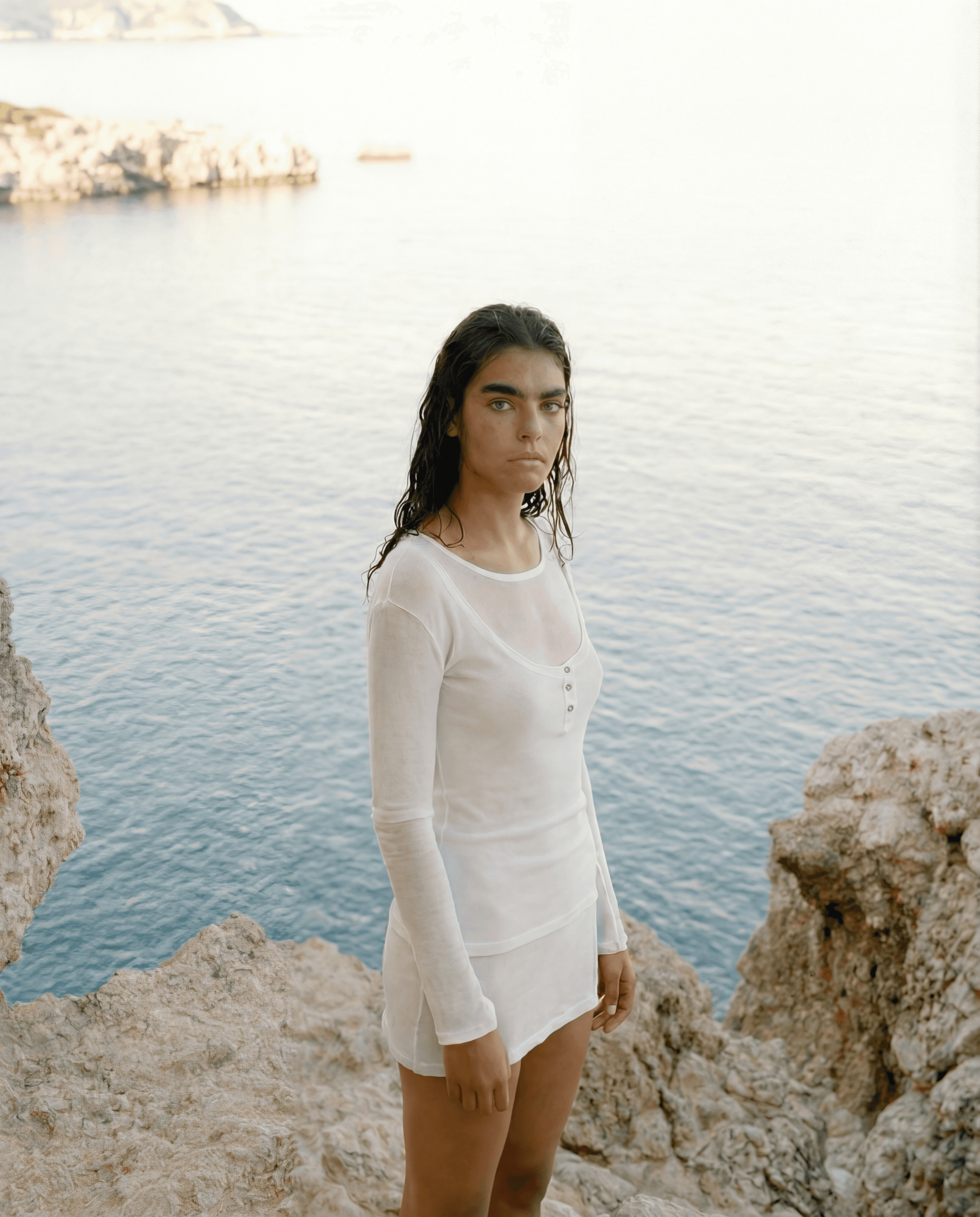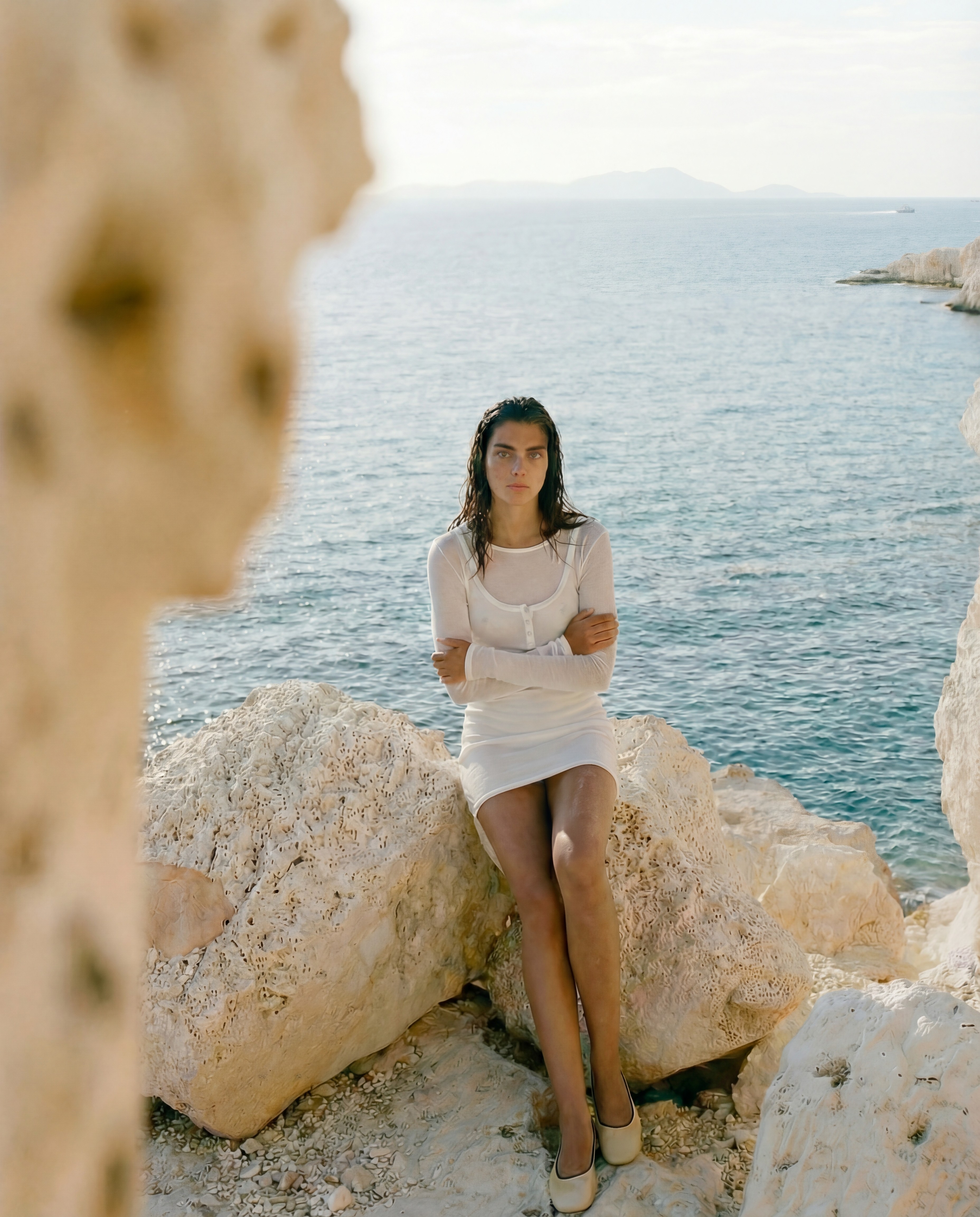 An AI-generated spec campaign inspired by the sea, the light and the women who live by it. Hyper-realistic video of a woman floating and swimming in open water, paired with a series of editorial stills capturing the warmth, stillness and sensory depth of the Mediterranean coast.